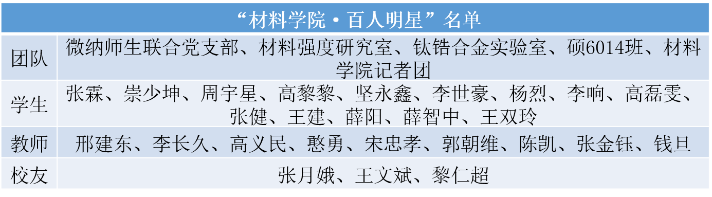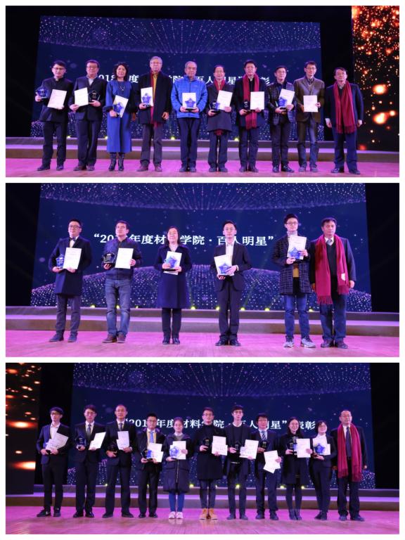 为了营造良好的文化氛围,增强凝聚力和向心力,树立榜样典型,落实立德树人根本任务,积极响应“弘扬爱国奋斗精神、建功立业新时代”的感召,本年度学院开启了“材料学院•百人明星”评选活动,该活动首批进行三年,最终产生一百位明星。2018年共有5支团队、9位教师、3位校友和14位学生入选,席光副校长、单智伟院长和潘希德书记分别为大家颁发荣誉证书和奖杯,以示鼓励,希望大家大会榜样引领和示范作用。