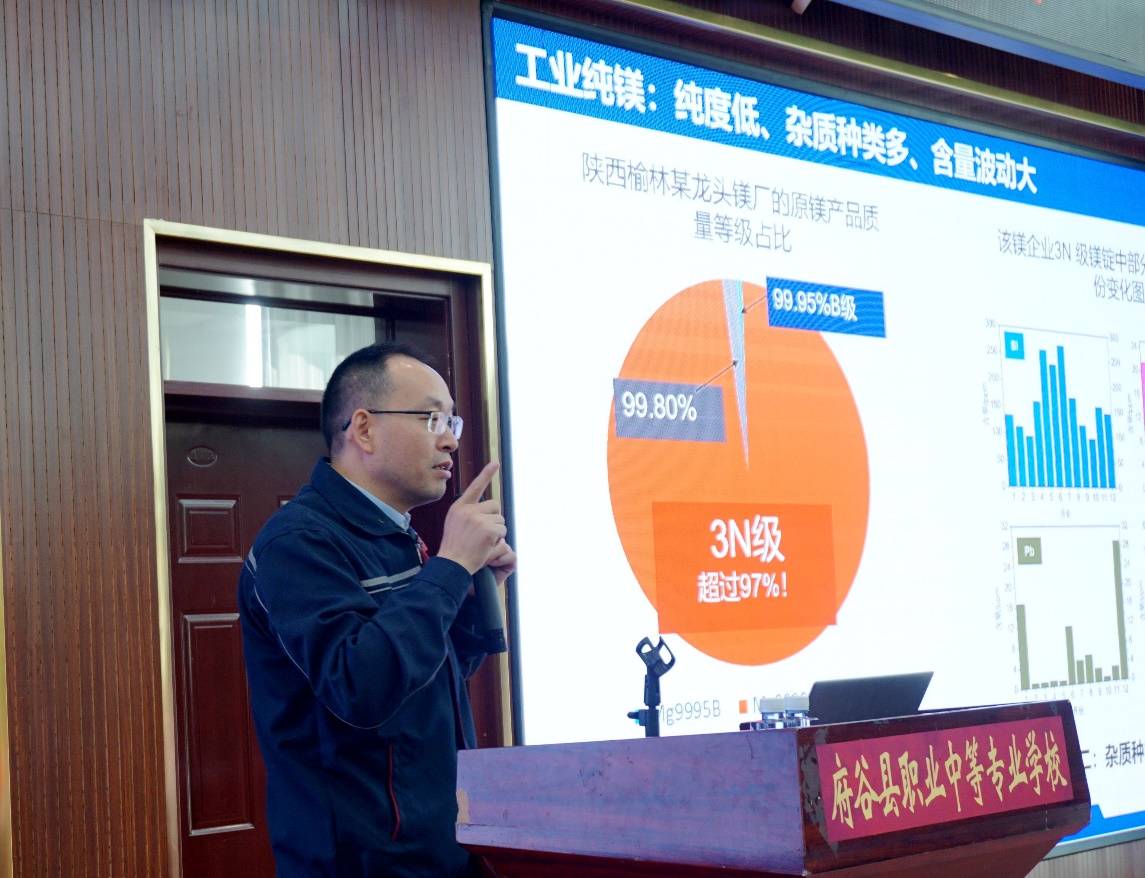 府谷县职业中等专业学校校长陈治平介绍金属镁实验实训基地概况。2021年,府谷职业中专煤化工专业定位为金属镁方向,开设两个专业班,招收新生100人,并与亿万先生mr07官网材料学院签订合作协议,共建专业,共育人才。镁专业班第一批学生已于2022年8月进入专业知识学习阶段。目前已建成的金属镁实训基地建筑面积约1000平方米,内设实训车间、化学检测实验室、物理实验室、光谱室,可完成“白云石煅烧—配料—制球—料球还原—粗镁精炼—精炼纯化”的全工艺流程,基地的建成将为府谷金属镁行业培养更多实用技能人才。