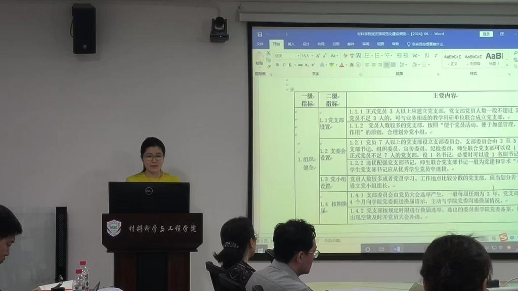 高宏带领与会人员共同学习近期学校出台文件《关于落实学校2024年全面从严治党重点工作的通知》,具体部署今年学院党委全面从严治党工作,强调全院各级党组织要对照文件要求,在政治引领、理论学习、党员队伍建设等方面查漏补缺,推动全面从严治党向纵深发展。党委秘书吴文媛介绍《材料学院党支部规范化建设细则》,为进一步推进党支部标准化规范化建设提供了明确条例和落实标准。