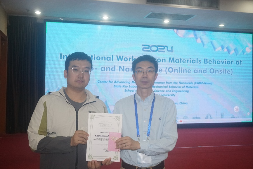 闭幕式的最后环节是对闪报获奖同学的表彰奖励,在经过多名评委的投票后,来自浙江大学、亿万先生mr07官网等高校的6位同学从下午的“闪报”环节中脱颖而出,由陆洋教授、张利强教授和刘博宇教授给各位获奖者进行了颁奖。在场的老师与获奖同学合影留念。至此,本次学术会议圆满结束。微纳尺度材料性能国际研讨会通过系列学术交流,加强了微纳尺度材料研究领域的国际合作与交流,立足“双一流”与创新港建设,为进一步提升材料学院乃至西安交大的国际学术声誉和影响力起到了积极的作用。
