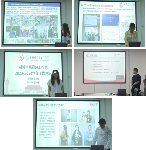 随后,材料学院团委韩静怡从夯实基层团建、强化青年思想引领、搭建实践锻炼平台及关注学生发展需求四个方面汇报了团委近一年的主要工作内容;研究生会曹洋从思想引领、学术育人、交流建设等方面汇报了研究生会在过去一学年所取得的成绩;党建工作组刘碧荷从组织建设、宣传工作、党建活动三方面展示了党建工作组在坚持党建引领、筑牢基层党建阵地、夯实基层战斗堡垒等方面的工作;西迁精神宣讲团吴东升分享了材料学院西迁精神宣讲团通过举办主题微宣讲、三下乡支教等活动,致力于弘扬西迁精神,强化思想建设;“文化+”工厂姚超回顾了过去一年在校园文化建设、学生活动、团队建设等方面的亮点工作,以服务师生为宗旨,不断加强校园文明建设。同时,各学生组织也反思了以往工作中的不足,并对后续的工作提出建议和展望。