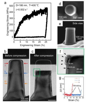 上述发现表明,微纳米尺寸的金属在适当的变形速率和温度下,可以拥有与半固态金属相媲美的优异变形能力。长距离扩散特性可用于加强加载点附近(至少在微米范围内)的金属/氧化物界面,或在不明显改变表面形态或表面尺寸的情况下调整柱子的长度,这在光学纳米柱阵列等器件上具有重要的潜在应用价值。