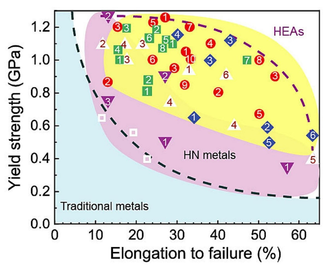 图1 金属合金的拉伸屈服强度 versus延伸率 (拉伸塑性)。浅蓝色区代表传统金属;粉红色区域代表纳米异构金属;黄色区中的高熵合金(不同颜色代表不同晶体结构的HEAs)有效地助力了高强度高塑性的同时实现: 许多“又强又塑”的新金属材料表现出向着图中右上角方向铺展的明显趋势。而右上角方向代表着人们长期以来追求的目标:“既有高强度合金具有的GPa级屈服强度、又有与单质金属媲美的大(~50%量级)延伸率”。
